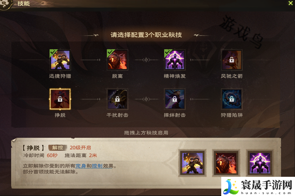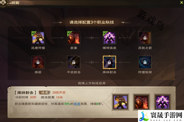 效果:射出绳索箭矢缠绕目标,对其造成70%的减速效果,持续8秒。