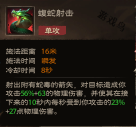 效果:射出附有蛇毒的箭矢,对目标造成你攻击56%+63的物理伤害,并使其在接下来的10秒内每秒受到攻击的23%+27点物理伤害。