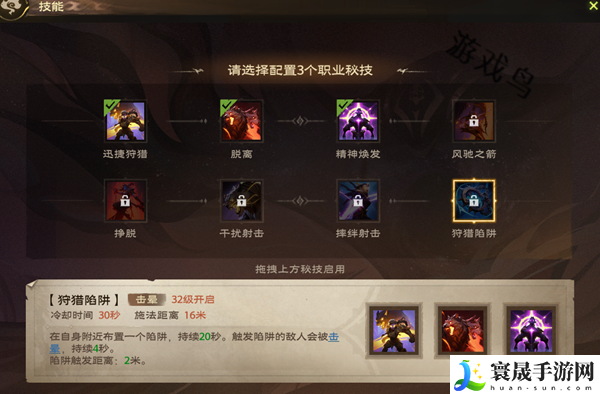 效果:在自身附近布置一个陷阱,持续20秒。触发陷阱的敌人会被击晕,持续4秒。