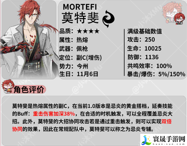 1、角色评价:莫特斐定位在副c和辅助之间,取决于用的什么武器,但是最好当辅助用,其延奏技能可以给下一位登场的角色重击伤害加深38%。而且重击会双倍触发莫特斐的大招。其实可以看出来莫特斐主要就是服务于重击体系,在目前版本可以说是忌炎的好搭档。