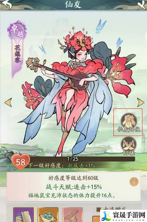 1、仙友幻化可以解锁仙友的皮肤,首次更新将上线花想容的【金秋赏菊】,解锁后仙友战斗天赋+20%(连击+12%)