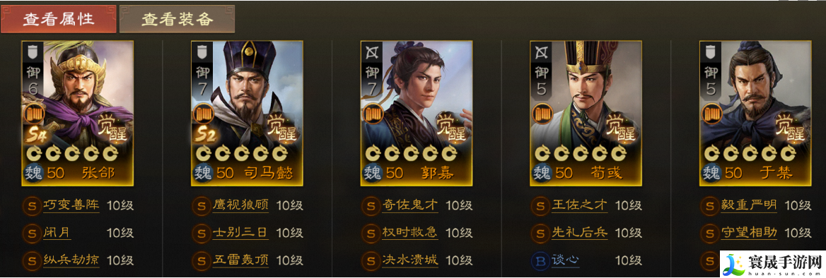 打法思路:开局后,获得【王佐之才】的司马懿在于禁的保护下踩阵试探,此时对方上前消耗,张郃找机会切入腹地使用【巧变善阵】打出伤害且群体"定身"与吸统,随后郭嘉在定身位置不断释放【决水溃城】,配合司马懿第三回合的爆发把范围内敌军一波带走。
