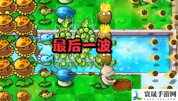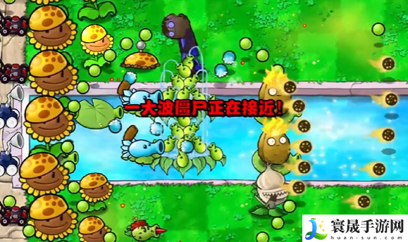 4、在第一波僵尸出现之后在放一个豌豆许愿池、两个火炬坚果和双发仙人掌。