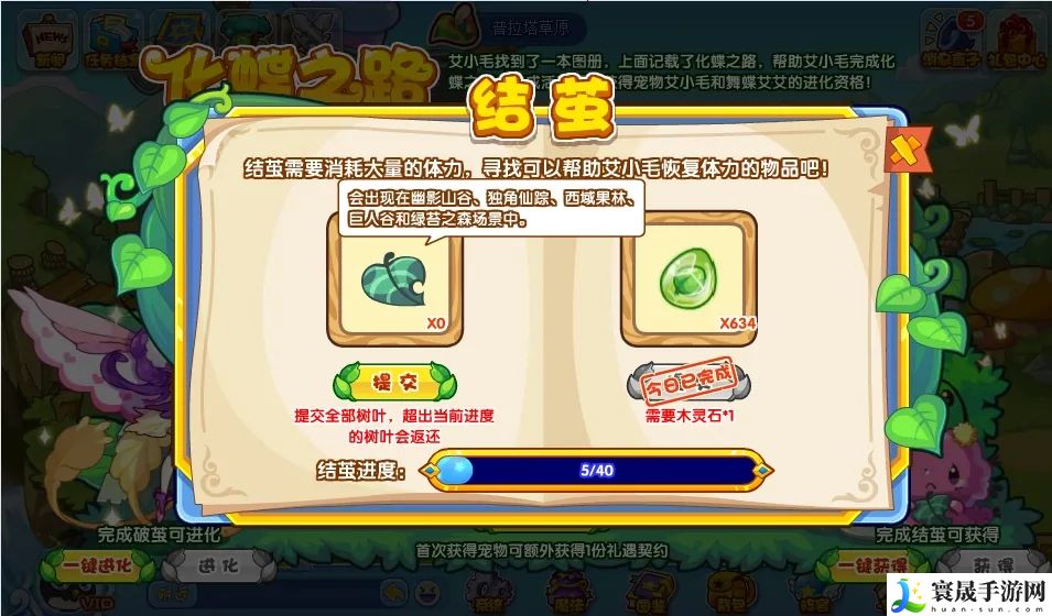 结茧有两个部分组成,提交树叶与木灵石,总共需要40点破茧进度,当结茧进度满足条件后解锁破茧。