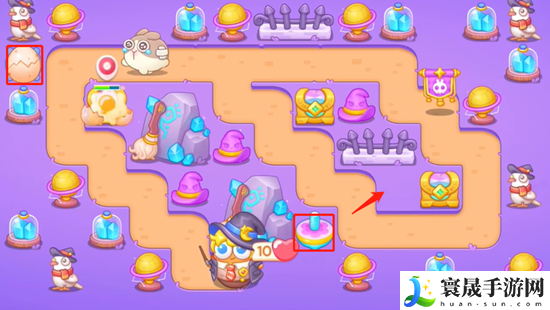 2、打掉之后我们继续放置冰锥,上宝箱给的是毒气,下面给的是聚宝盆,出口这里防御,左边我们清理道具。