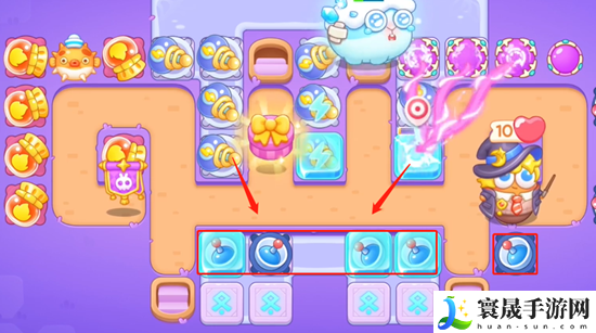 2、这一关不要急,我们使用河豚打掉中间道具,放置满级喷火器,重点也是增加魔法球数量,喷火器打掉道具继续放置喷火器。