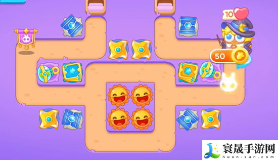 阿波与魔法宝藏第50关路线是一个比较负责的回转路线,并且加入了超大宝箱,打掉可以获得四个炮台,给我们的炮塔有泡泡、魔法球、冰锥、卡牌和忍者镖。