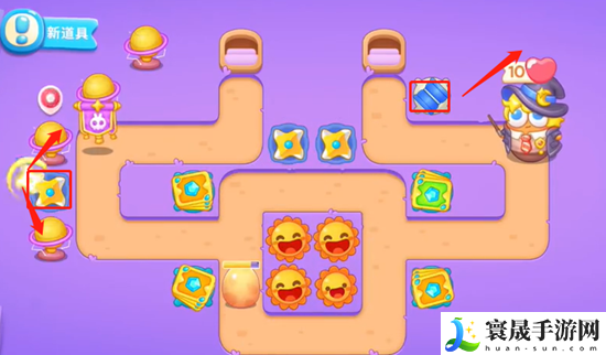 2、打掉宝箱之后,获得四个太阳花,先不要着急升级,使用卡牌打掉天平放置忍者镖,然后清理上面道具,