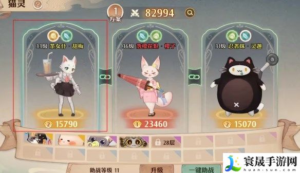 3、上阵的三只猫灵中,第一只无法触发技能的连锁效果,建议将战力高/且能触发连锁技能效果的猫灵放置在第二、第三号位;