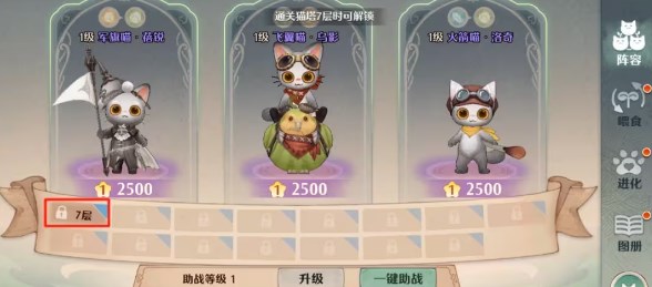 4、多打阿奇古塔开助战位,升级主战位可以上阵更多、更高品阶的猫灵,提升角色属性(助战猫灵30%的属性将转换增加给角色)。