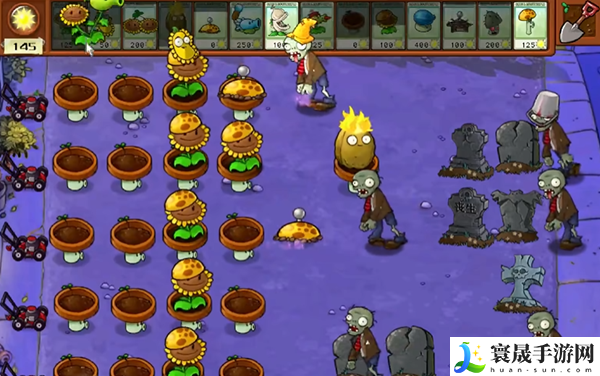 3、期间有难处理的僵尸就提前放好阳光土豆雷,无需消耗阳光的同时还能帮助我们清掉血量厚的僵尸。