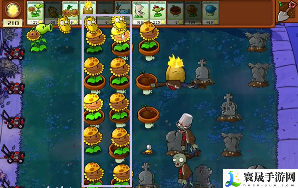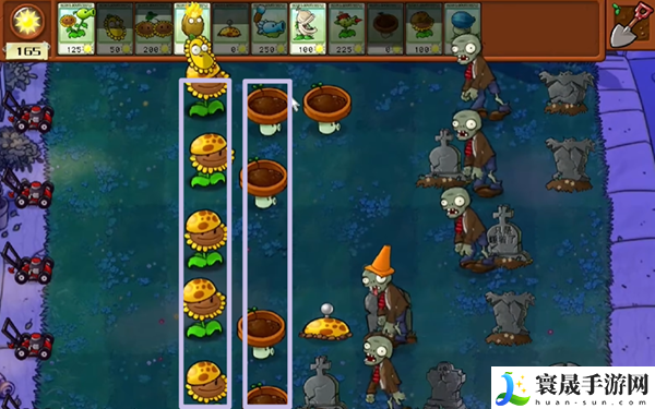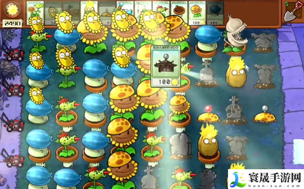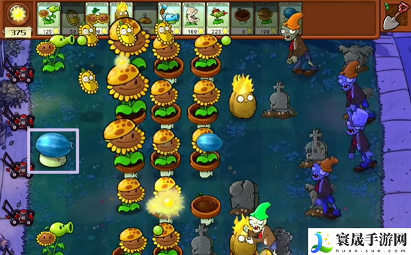 4、中期我们有两列的阳光向日葵之后就去建造冰瓜大喷菇,优先建在中间,可以打三条路的敌人。