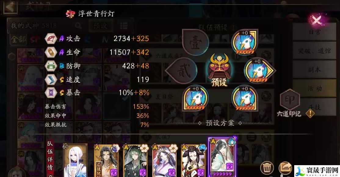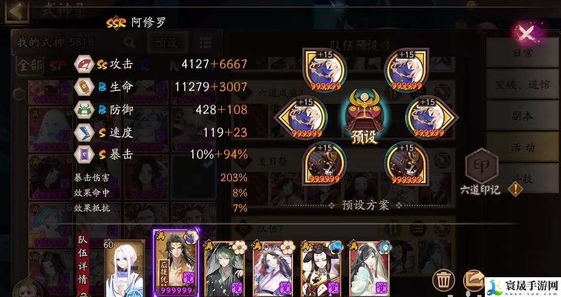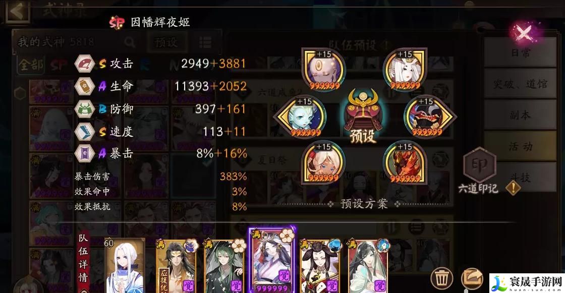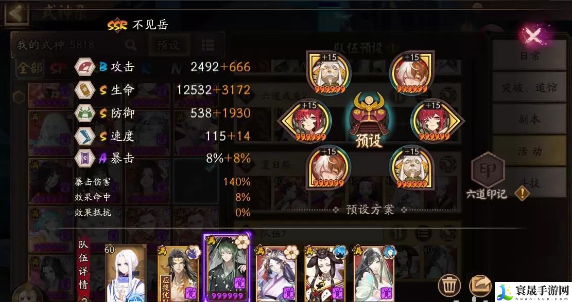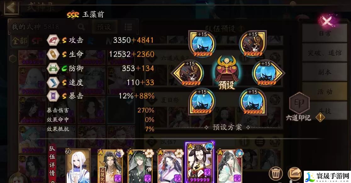 1、阵容:玉藻前+阿修罗+因幡辉夜姬+不见岳+SP灯+晴明(小晴明最快)