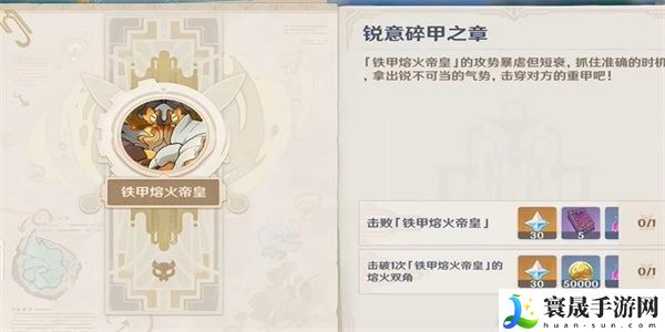 原神锐意碎甲之章任务中我们需要击败铁甲熔火帝皇还有它的熔火双角,接下来我们就来看看铁甲熔火帝皇之皇在哪里吧,在来到指定地点后我们就可以对其发起攻击了,最后击败指定目标后我们就可以完成任务了!