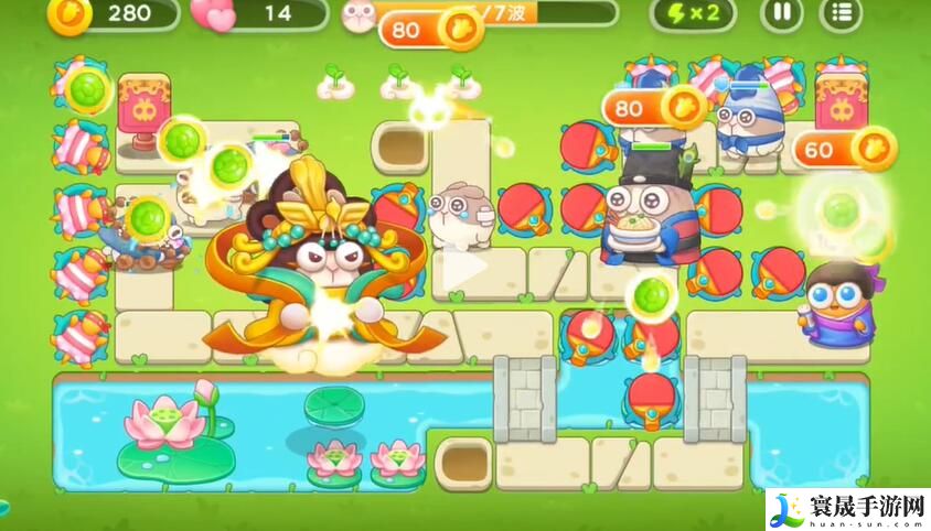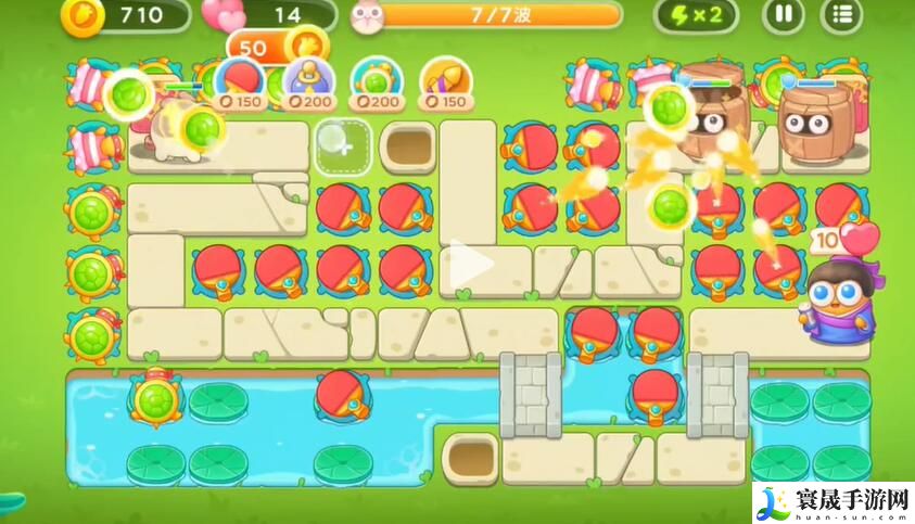 1、开局之后使用乌龟打左边的建筑,获得金币给乒乓球升级消灭兔子。