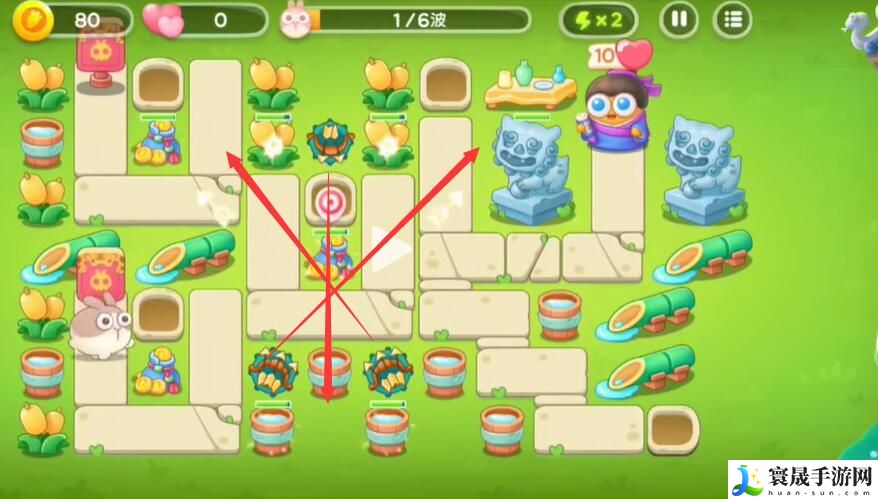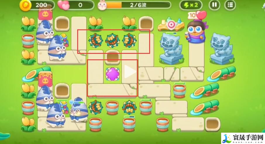 2、在第二波上面的出口就会有兔子。有空位置就尽快的放置弓箭等一些炮塔。