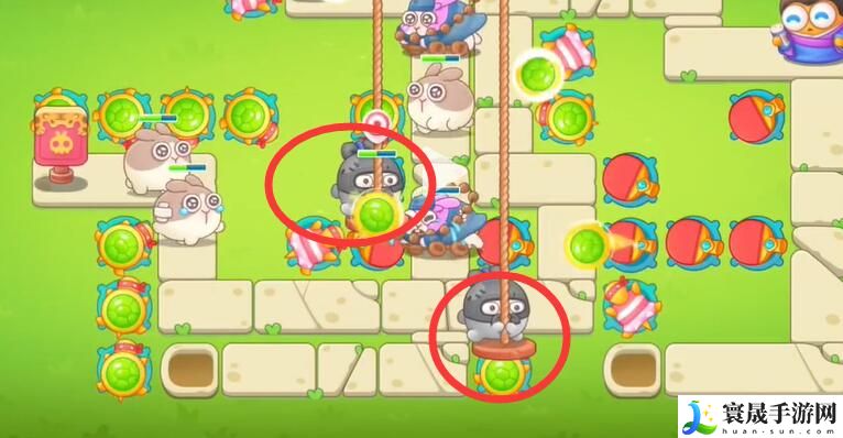 1、在左下出口这里放上乌龟来清怪,右边放上乒乓球牌清理建筑。