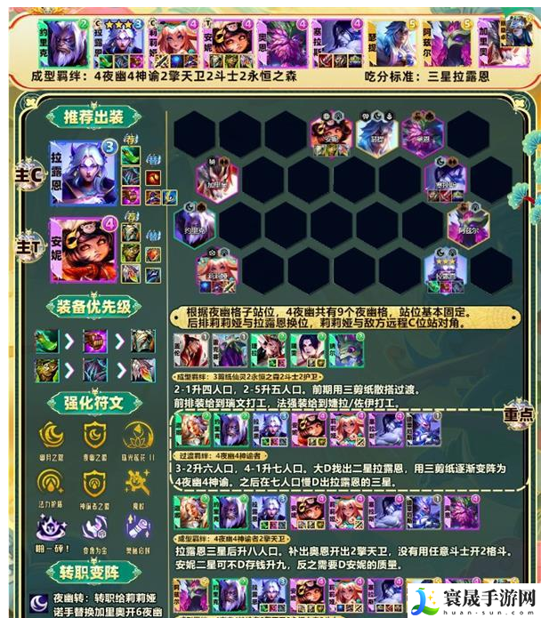 夜幽转(金铲铲+拳套):转职给到莉莉娅。七人口优先开6夜幽3神谕,八人口开6夜幽4神谕,九人口补奥恩。