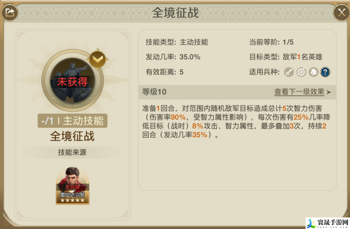 后期直接换上全境征战,准备1回合,对范围内敌军造成5次智力伤害(伤害率为90%),每次的伤害还有25%的概率降低目标8%的攻击和智力属性,最多可叠加3次,持续2回合,因为专属头衔的关系我们都携带主动技能,而多段的伤害也能更好的发挥出我们智力属性高的特性。