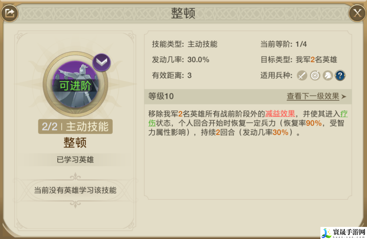 技能2我们前期使用整顿,移除我方2名单位的减益效果,并使其进入疗伤状态,个人回合开始恢复一定兵力(回复率为90%),持续2回合(发动概率30%),整顿在对上控制阵容使有着非常好的效果
