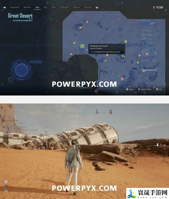 2、之后得知塞德里克需要伊芙在大沙漠的超级管道中为他找到能源,就在地图最西边,很容易发现,是钻出沙地的一条白色管道;