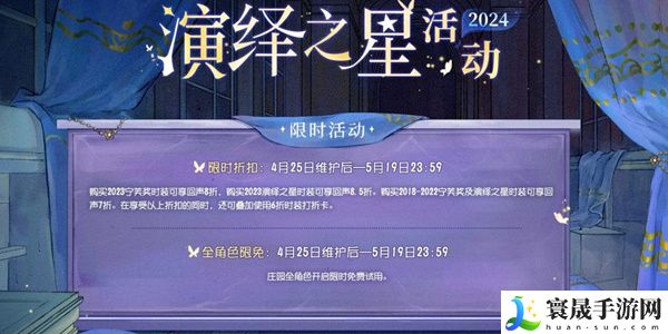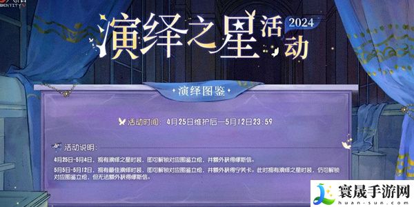 1、本届演绎之星活动中,为帮助访客们选出最符合自己喜好的演绎之星/最佳演绎,《第五人格》将于4月25日维护后至5月19日开放全角色限免,你可以选择任意角色参与游戏,亲身体验TA的演绎实力。