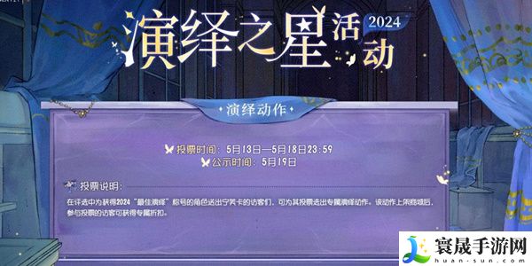 2、5月13日至18日,在评选中为获得2024“最佳演绎”称号角色送出宁芙卡的访客们,可投票为其选择专属演绎动作。在后续该动作上架商城后,参与投票的访客可获得专属折扣!