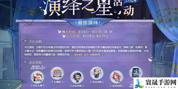 1、5月5日至5月12日,本年度的最佳演绎评选将限期开启。该奖项仅限往年获得过“演绎之星”的演员参评,访客们需完成各项任务获得宁芙卡,用赠卡的方式支持各位演员。最终仅有获得宁芙卡最多的台上星可以荣获“最佳演绎”的称号,还将获得由缪斯剧院为其量身定制的稀世时装!