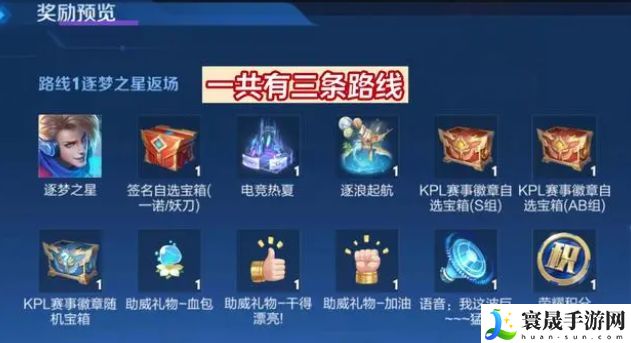 马可波罗KPL限定、签名宝箱、电竞热夏回城、逐浪起航回城和两组徽章被归类为6个大奖,每个关卡只会产出一个(概率2%),若抽中后,这个关卡就不需要再参与了,大家记得更换关卡,避免点券浪费。