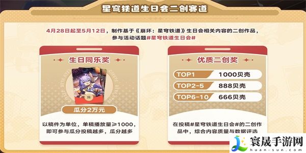 3、4月28日起至5月12日,制作基于《崩坏:星穹铁道》生日会相关内客的二创作品,多与活动话题#显穹铁道生日会#也有机会领取到大奖。