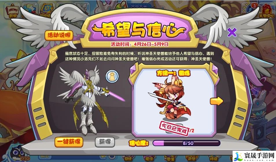当信心度满足界面所示的要求后,即可召唤:神圣天使兽!一键购买:788洛克钻,不限量。首次获得宠物可额外获得:希望徽章。