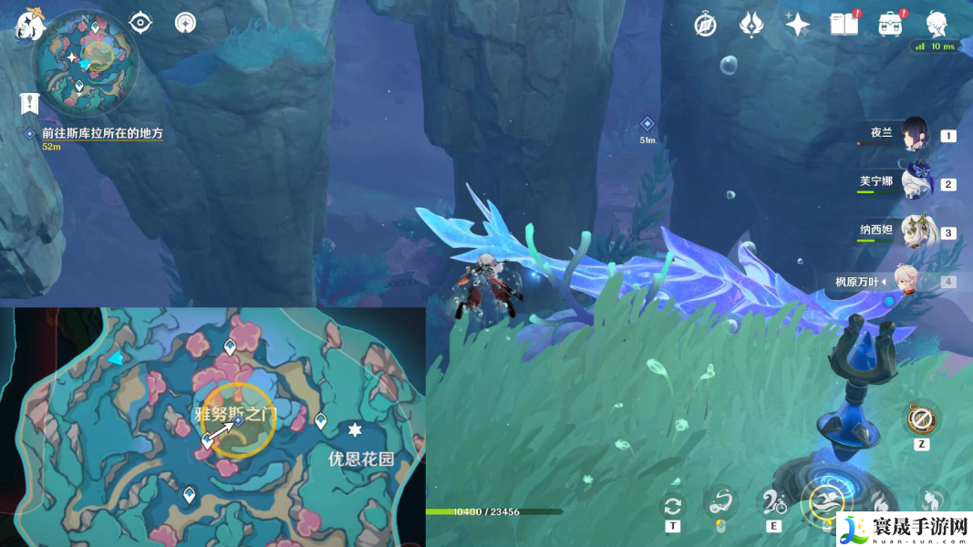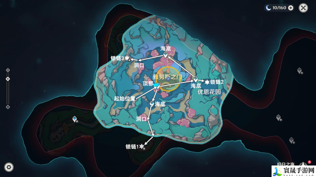 5、往地图的东北方向游,优先开启顶部锚点,然后需要完成【解开束缚斯库拉的锁链】,这个有难度,解开方法如下:
