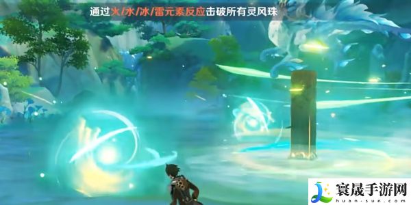 4、最后等到它恢复再次释放风属性的技能时,我们可以使用与风属性发生扩散反应的角色将风球击破即可获得成就【吉位】。