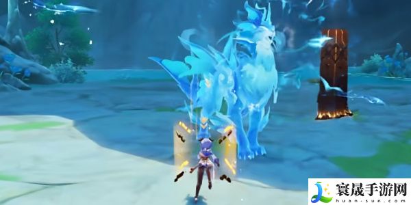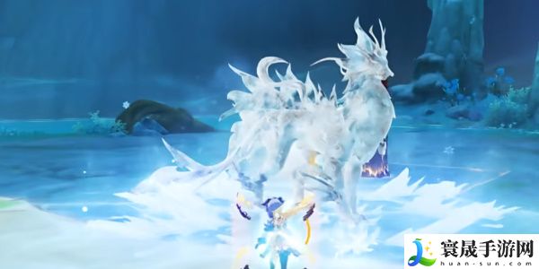 2、接着我们进入战斗,在战斗中隐山倪兽会释放一个水元素的技能,屏幕中间会出现提示,让我们使用冰元素角色(神里绫华、甘雨等)将其冻结。
