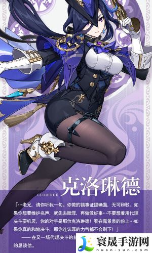 克洛琳德是一位雷元素五星角色,命之座是迅捷剑座,她是枫丹著名的决斗代理人。根据米哈游的一贯作风,当新角色的立绘介绍出现后,那么该角色就会在下个版本登场,因此我们可以得知克洛琳德将会在4.7版本上线。