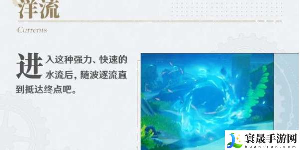 3、洋流:玩家在枫丹水下探索时会遇见这种形状的水流,它就是洋流进入洋流后这里的水流更加强力、快速,可以帮助旅行者快速到达终点。