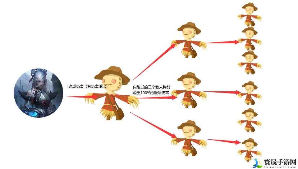 效果:造成击杀时的过量伤害+100会对目标附近的三个敌人造成等额魔法伤害
