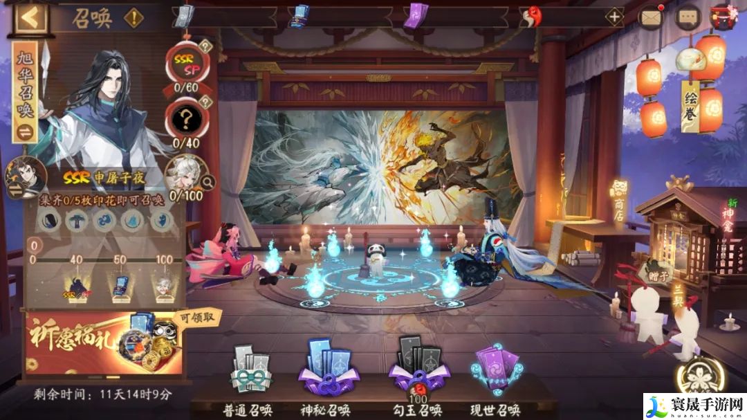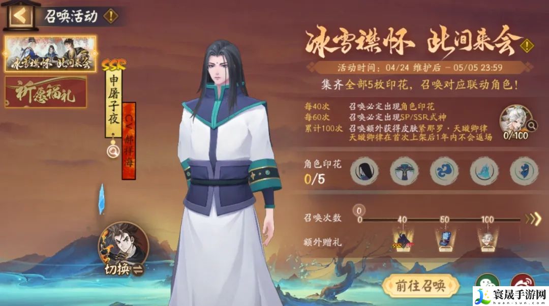 当大人选择限定联动角色SSR申屠子夜为定向角色时,使用神秘的符咒、勾玉、现世符咒进行召唤时有1%概率获得「申屠子夜印花」,集齐对应5枚申屠子夜印花即可契约召唤限定SSR申屠子夜。