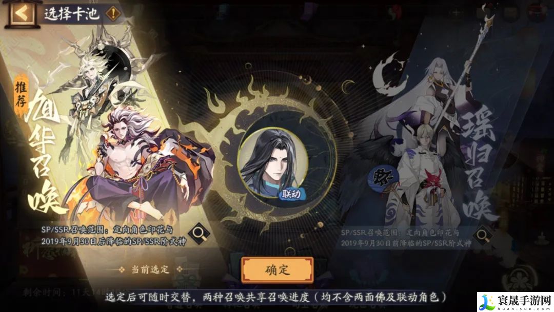 「旭华召唤」可召唤的SP/SSR式神范围为2019年9月30日起降临平安京的SP/SSR式神与全新SSR阶联动角色申屠子夜、闻人翊悬印花