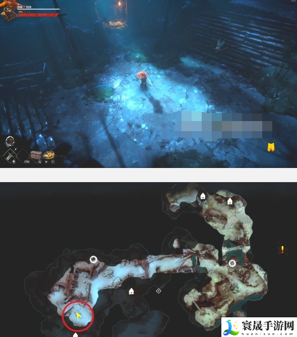 第三个位置是水手寨入口附近,就在浅滩的篝火旁边。在水手寨里外能见到许多蒿草和蘑菇,但分布比较散,不过敌人都比较好对付,懒得打怪可以用手柄L3快速传送(可能会被修复),大约一趟可以获得7个蘑菇。