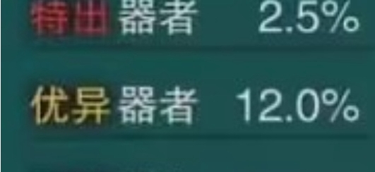 2、特出器者出现的概率是2.5%,优异器者出现概率为12%,新生器者出现概率是85.5%。