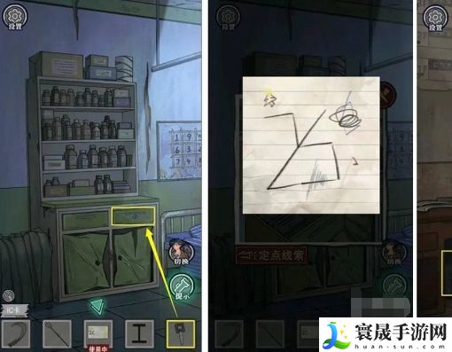 2、前往3F,进入医务室,打开药柜抽屉,得到【钥匙】,前往1F,用【钥匙】进入联络室,在桌上可以获得格子颜色线索。