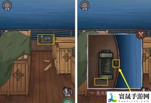 12、上船后,查看放在设备上的小册子,得到【黑木的照片】,用【长钩刀】砍箱子,得到【声呐设备】。