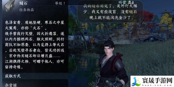 2、和他对话得知他想通过**燧石赚钱,我们向他出示燧石,更新传闻。