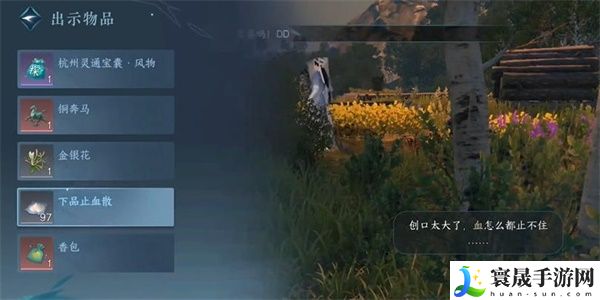 3、接着我们前往到雁门关【615,740】的位置,得知NPC流血受伤了,然后把止血散出示给NPC。