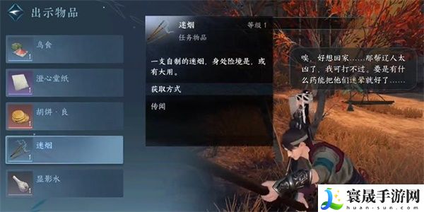 2、接着就在与NPC对话中得知,NPC需要迷烟,我们把迷烟出示给NPC之后,就可以继续对话。