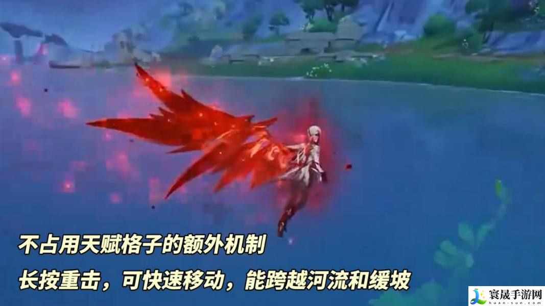 4、【额外亮点】持续长按重击,会进入快速移动状态。从呈现的状态来看,应该与那维莱特是相似机制,脚底浮空,可跨越河流以及快速攀登缓坡,但移动速度更快些。这种额外机制也不占用天赋,在实战转移战场或大世界部分地形有用,挺好的。