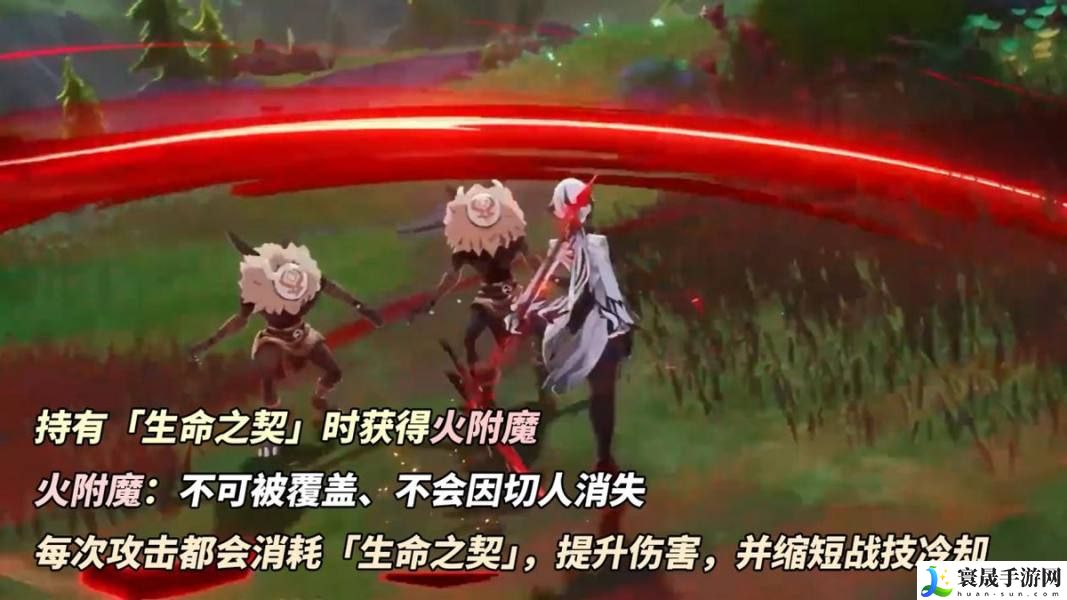 1、【核心玩法】当阿蕾奇诺身上持有「生命之契」时,普通攻击、重击与下落攻击将转化为无法被附魔覆盖的火元素伤害,并会在每次普通攻击命中敌人时,消耗「生命之契」来提升攻击伤害,并缩短战技冷却。由于「生命之契」不会因为切换角色而消失,意味着仆人的火附魔可以用来前置挂火扩散,配队和输出轴也会更自由些~