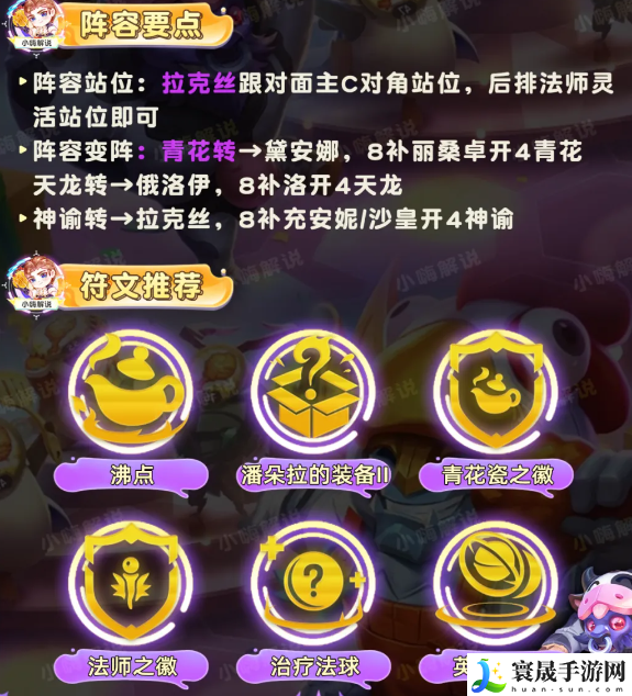 ①拉露恩是直接技能会放到对手血量最多的一排,因此特别克制像版本毒瘤神谕莉莉娅、斗射卡莎这些阵容。