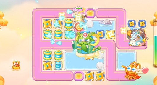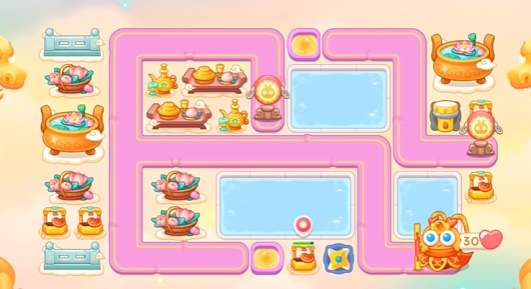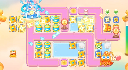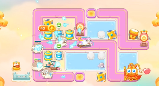 2、需要等待水里面出现建筑,然后打掉才能不断的放炮台去打左边的道具。